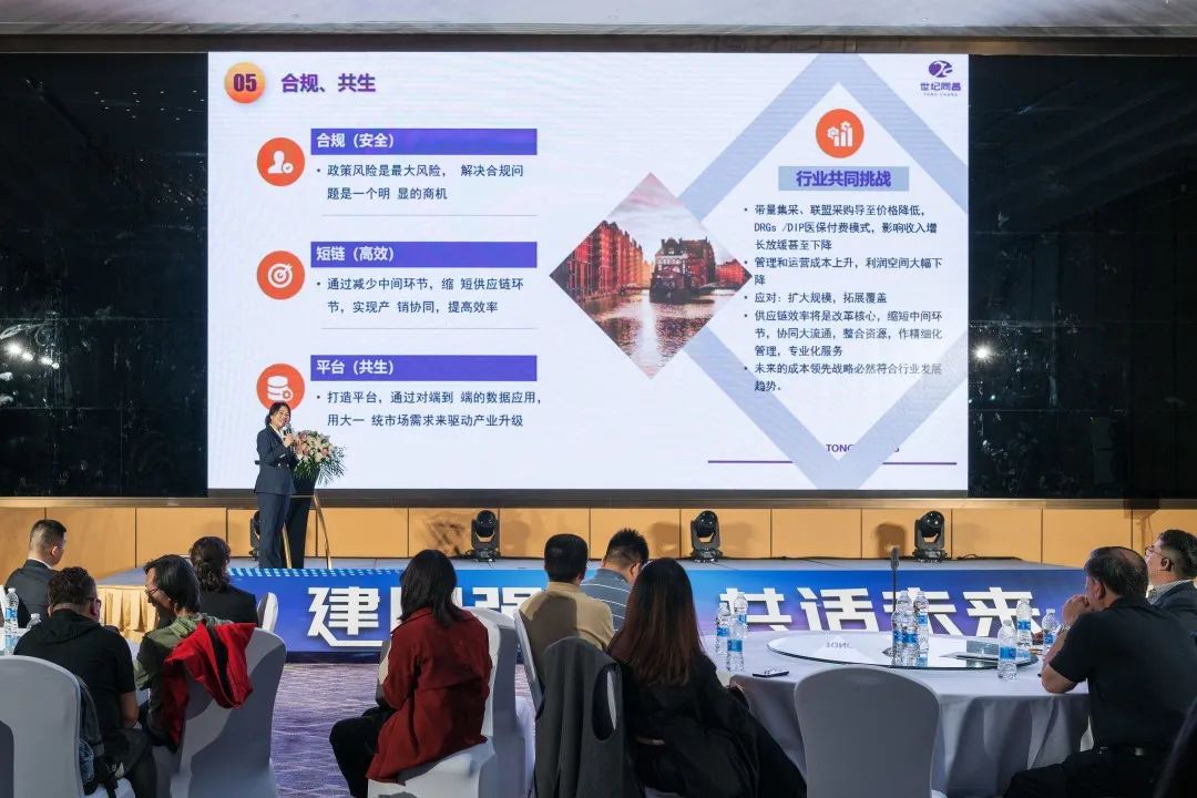 隨后,同昌集團旗下四川同昌冷鏈醫藥物流有限責任公司總經理崔光蘭女士、四川世紀同昌科技發展有限公司總經理閔子強先生、成都同昌醫學檢驗所有限公司總經理譚輝先生先后登臺,結合各自主營業務及服務優勢向現場嘉賓形象展示了世紀同昌的綜合服務能力,集團財務中心經理羅文博從企業融資角度就獲取銀行低息貸款、應收賬款盤活、降低壞賬風險等方面與現場嘉賓進行了深入的交流。